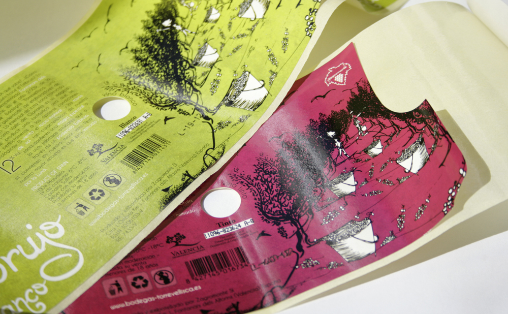 Para ello, se utilizarón dos colores pantone vivos, dinámicos y frescos (que posteriormente se convirtieron a CMYK). Uno para tinto y uno para blanco, que identificaban al mismo tiempo el líquido que contenian. La ilustración realizada para el labeling muestra la unión entre tradición y modernidad.Decidimos apostar por una sola etiqueta que contuviese tanto la información exigida por D.O. Valencia, como la imagen de marca del vino,