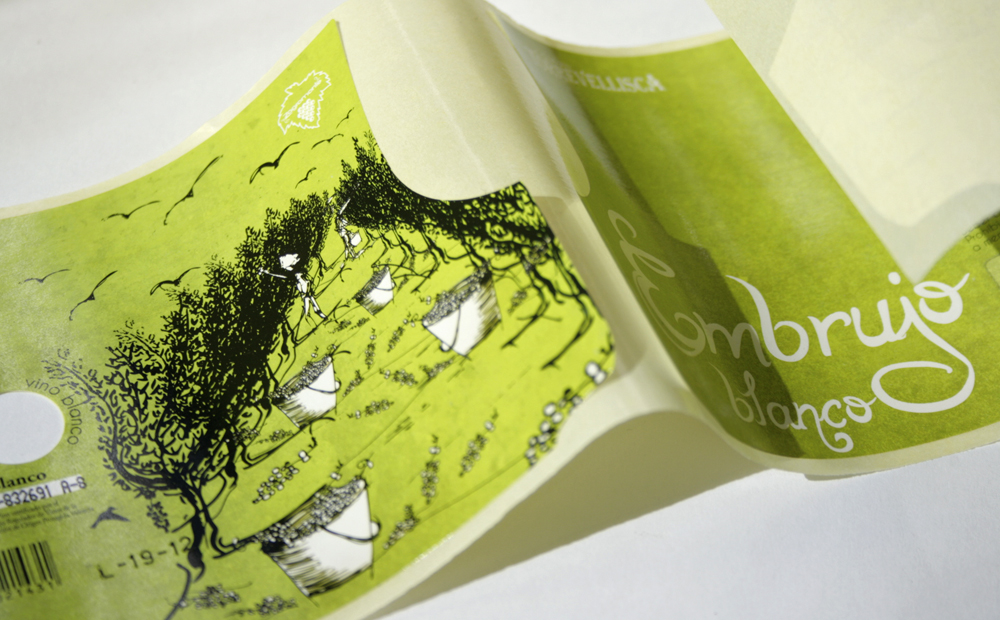 Embrujo blanco. Detalle troquel etiqueta. Diseño labeling para vino blanco de las bodegas Torrevellisca-Zagromonte